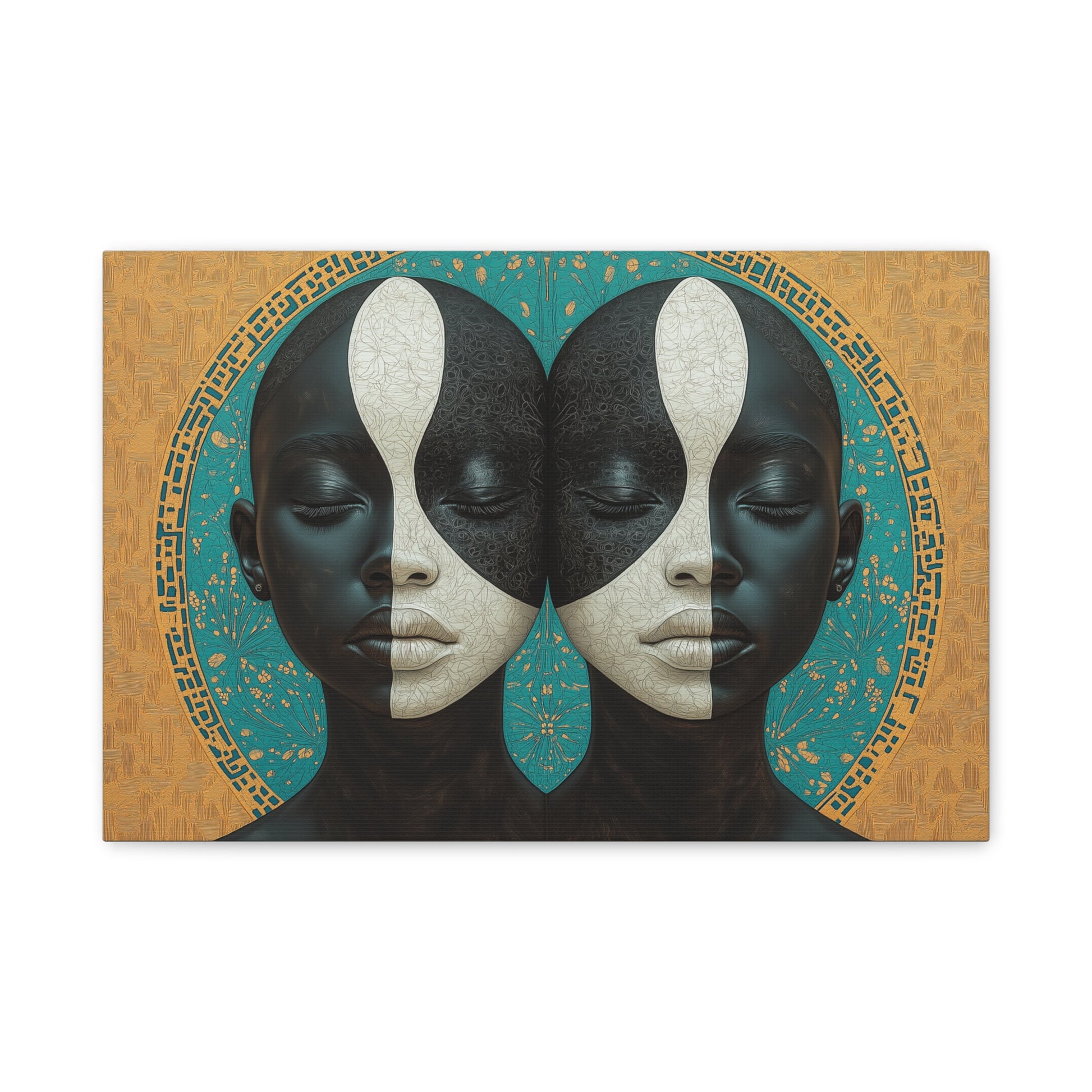 Introducing "Duality of the Soul" Modern Matte Canvas Print, a mesmerizing piece of art that explores the harmony of balance and contrast. This stunning composition features two mirrored figures adorned with an intricate yin-yang-inspired design, symbolizing the interconnectedness of light and darkness. Set against a rich turquoise and gold geometric backdrop, this artwork exudes a sense of spiritual depth and cultural elegance. Perfect for those who appreciate symbolism and timeless beauty, this piece adds a thought-provoking and sophisticated touch to any space. Materials: cotton and polyester composite (canvas), pine wood (frame) Soft rubber dots on bottom back corners for support Back hanging included Inner frame made with radiata pine sourced from renewable forests Thank you for visiting TheCivilized, and congratulations to you for choosing to add, art, energy, and inspiration to your work of living space.