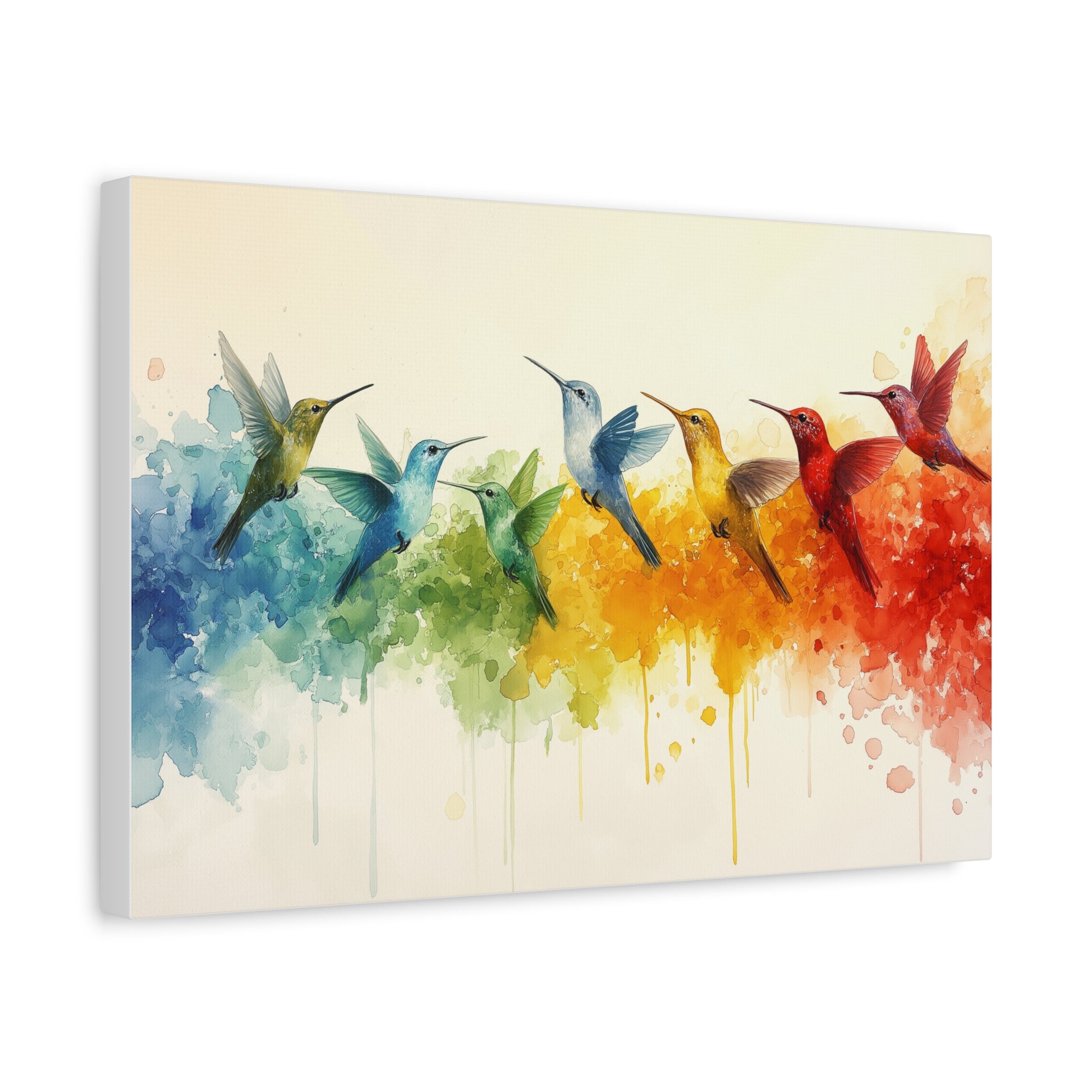 Introducing "Humming Birds" Modern Matte Canvas Print, different color Hummingbirds, in formation, vibrant colors, marble white background. The hummingbird symbolize joy, freedom, perseverance, creativity, love and healing. Bringing a playful and peaceful aura to any room.