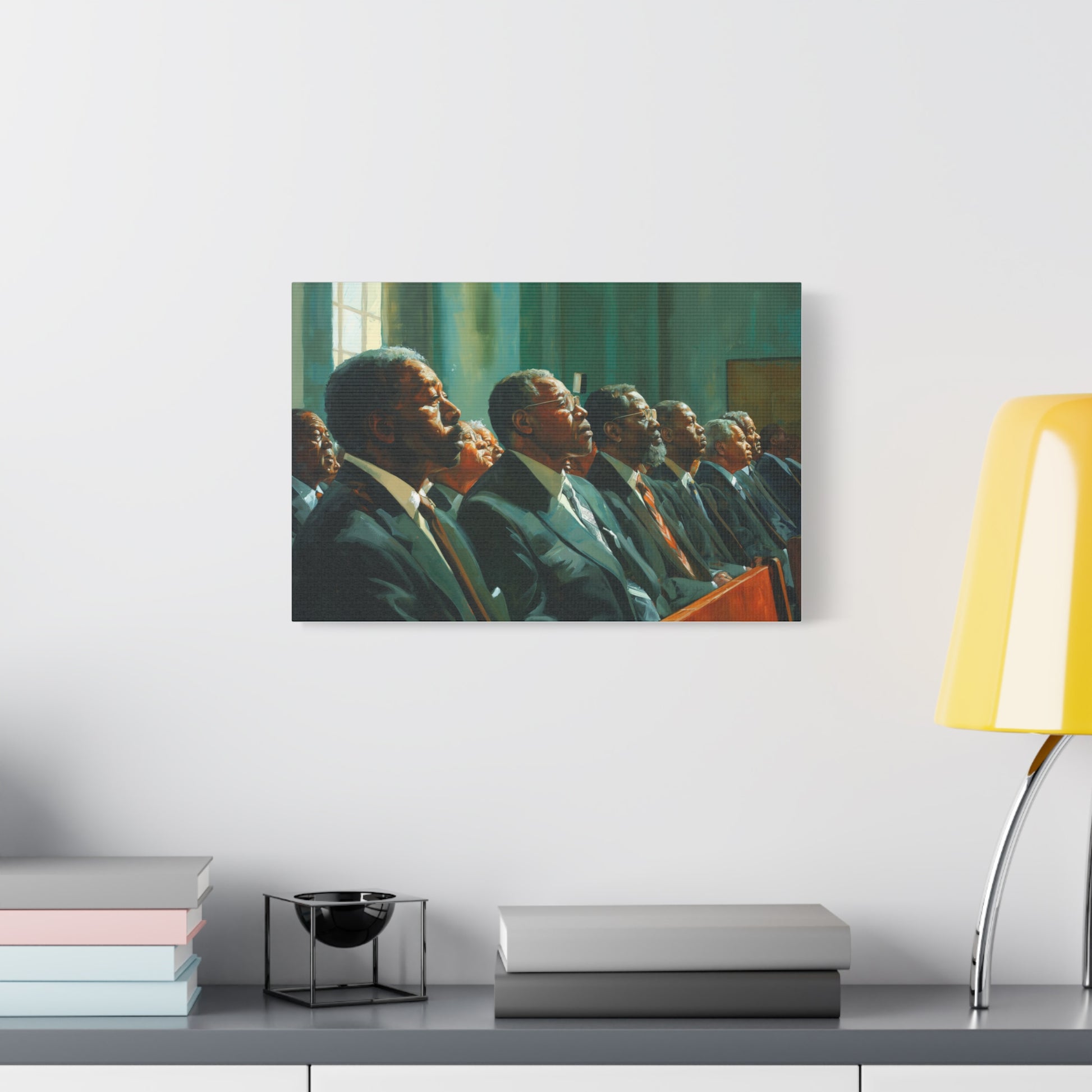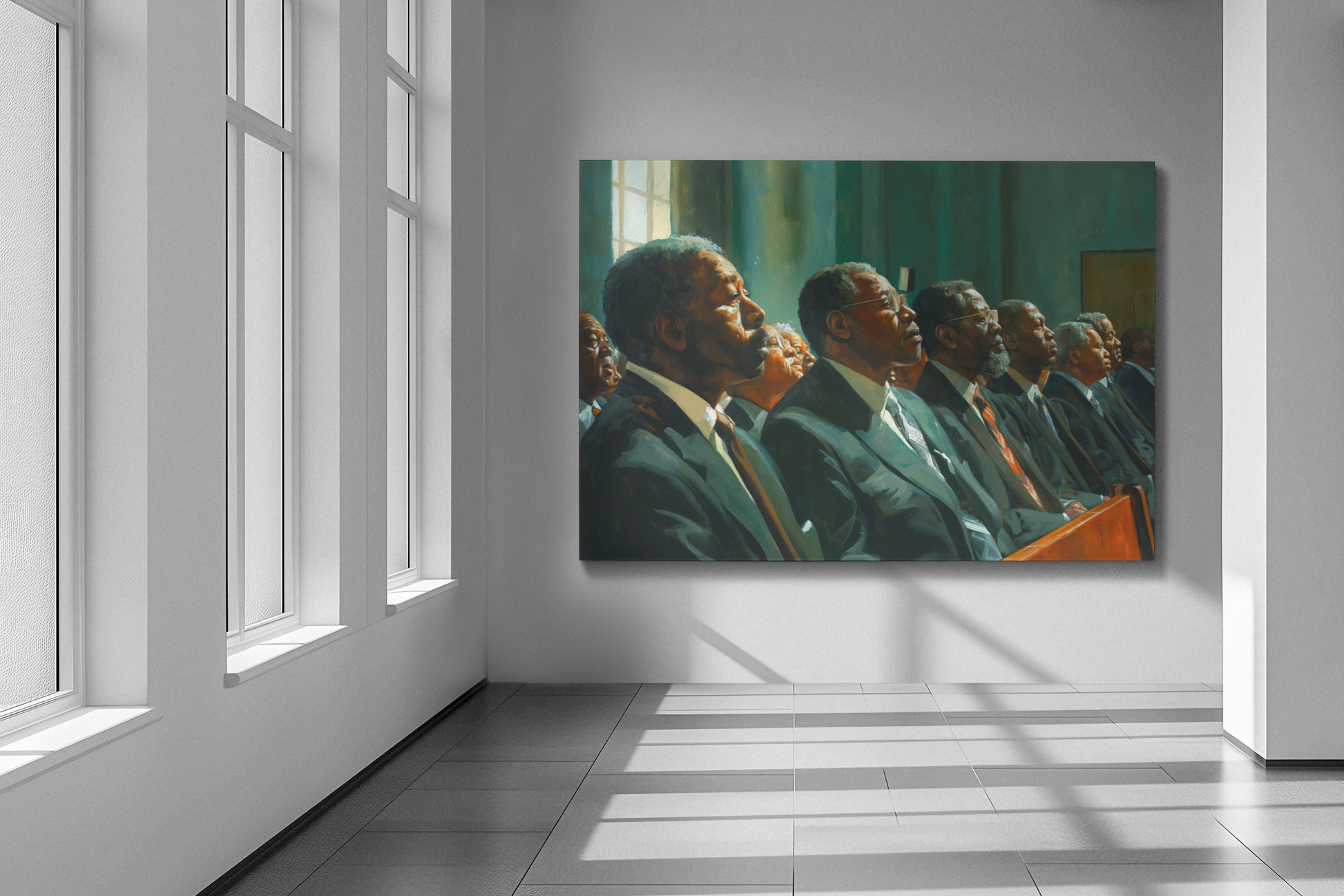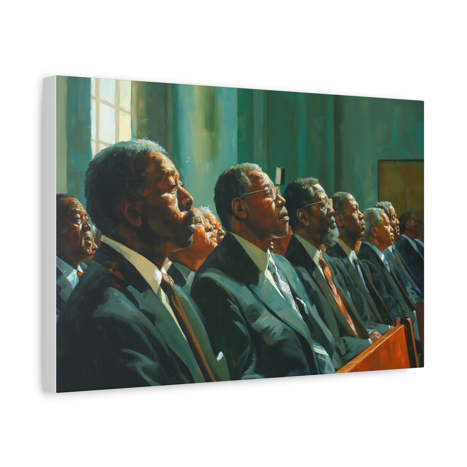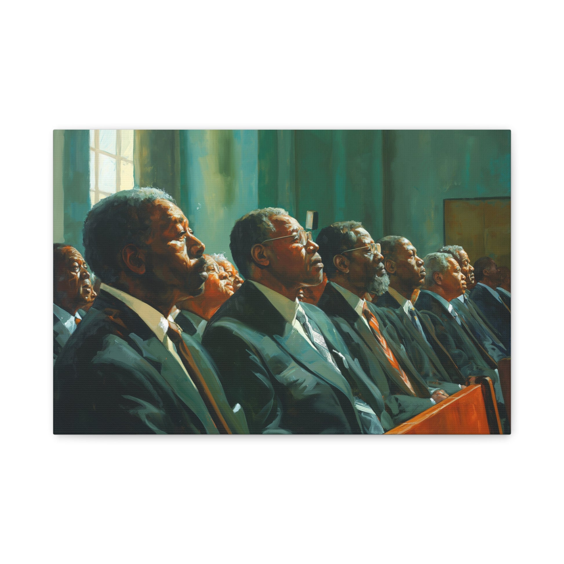 Introducing "The Elders" Powerful Matte Canvas Print, group of male elders sitting in first row of church. Dignified and attentive while receiving the word of God. Inspiring showing of unity, maturity, and dedication.